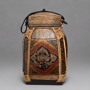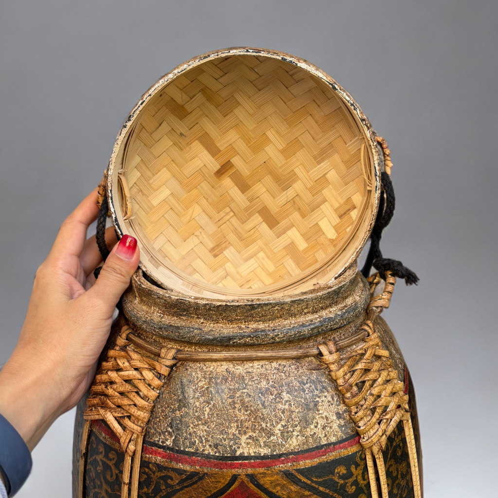 Craftsmanship Authentic Thai Design. Intricate Hand-Painting. The body is meticulously decorated with traditional Thai motifs, featuring rich, bold colors like deep red, matte gold, and black against an aged, textured background. The central design often represents stylized floral or temple patterns. The natural, light-tan rattan accents are woven vertically around the body, securing the pieces and adding a beautiful textural contrast. It is practical & decorative. Perfect for collectors of Southeast Asian art, or for adding a global, bohemian, or eclectic touch to any interior space, such as a living room, dining area, or study.