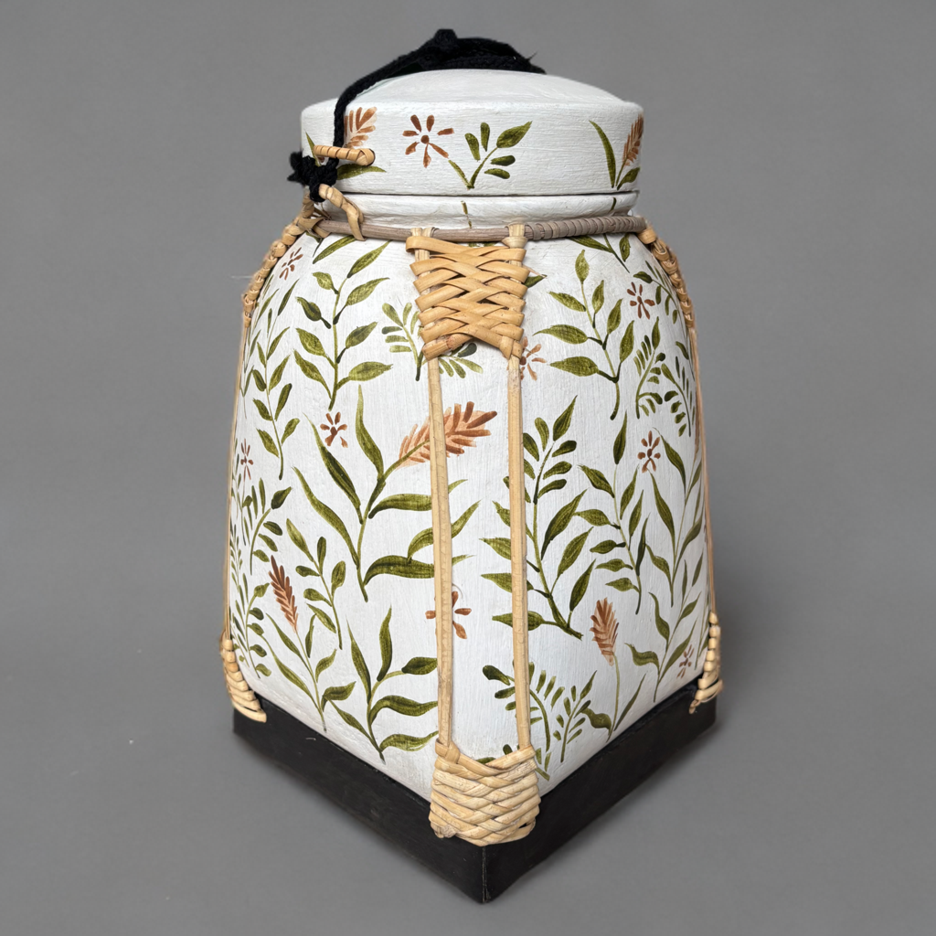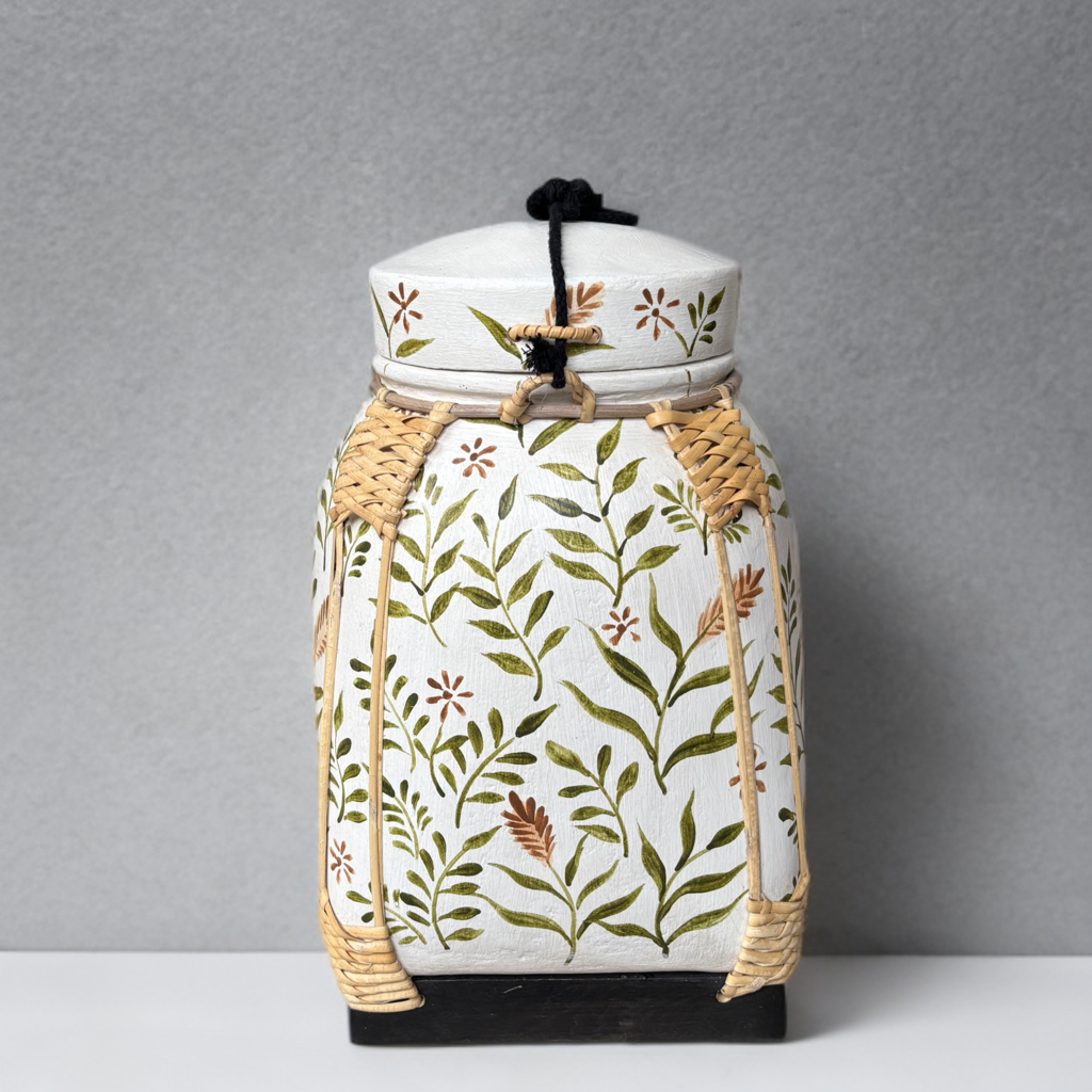 Craftsmanship Authentic Thai Design. The body is meticulously decorated with floral pattern. The natural, light-tan rattan accents are woven vertically around the body, securing the pieces and adding a beautiful textural contrast. It is practical & decorative. Perfect for collectors of Southeast Asian art, or for adding an eclectic touch to any interior space, such as a living room, dining area, or study.